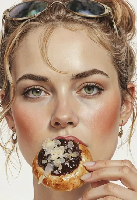 Prompt: round pastry, It has a golden-brown, slightly puffed crust that forms a shallow well in the center. This well is filled with a variety of colorful dollops of different fillings. There are dark, textured dollops of poppy seed filling, contrasting with smooth, white dollops of cheese filling. In the center, there is a dollop of a deep red, glossy fruit filling, likely jam, on white plate
