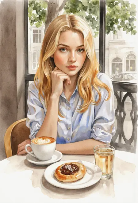 Prompt: round pastry with a light golden-brown crust. The center features a ring of creamy, off-white filling, a sweet cheese or curd. In the very center of this creamy ring is a dollop of bright red filling, which appears to be fruit jam, cherry or another type of berry, white plate, wooden table