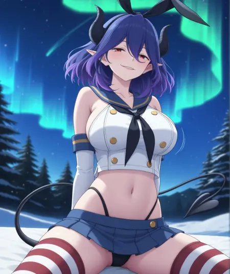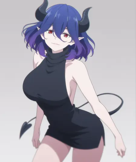 红眼睛,短发,中发,刘海,头发遮住眼睛,紫发,蓝发,尾巴,角,黑角,尖耳,恶魔女孩,恶魔角,恶魔尾,