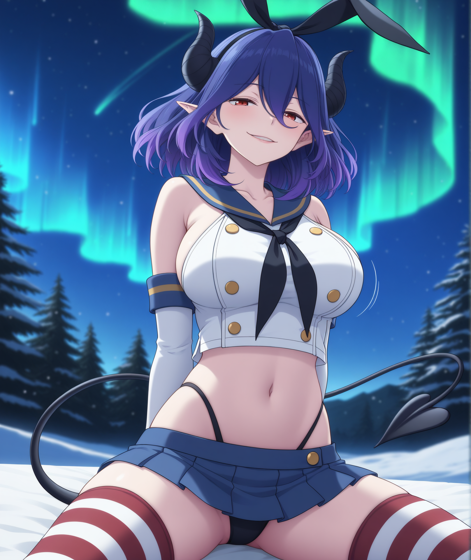 赤い目、短い髪、中くらいの髪、前髪、目の間の髪、紫の髪、青い髪、尾、角、黒い角、尖った耳、悪魔の少女、悪魔の角、悪魔の尾,