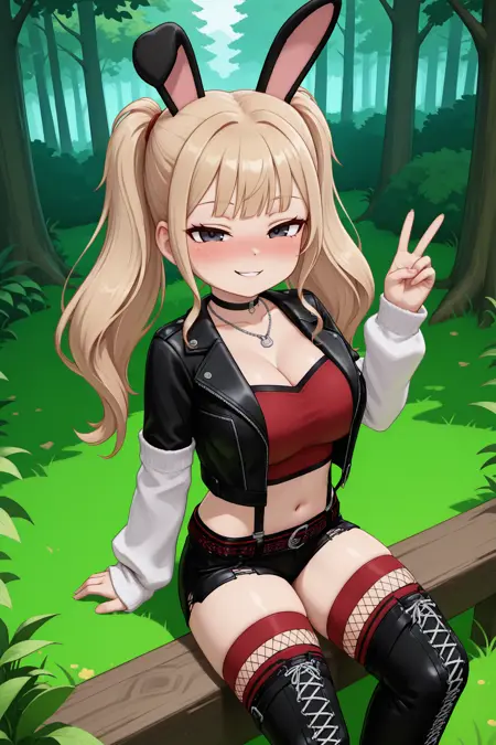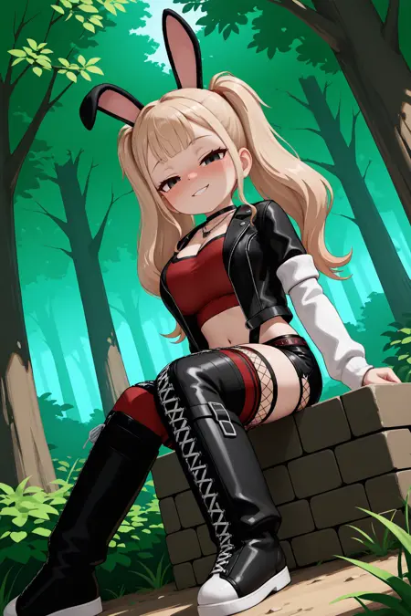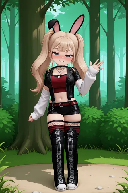 ➜ tuconejitakiller666OCILXLv2, 검은 눈, 금발 머리, 더블테일, 긴 머리, 앞머리, 검은 토끼 귀, 동물 귀, 큰 가슴, 검은 목걸이, 목걸이, 검은 자켓, 빨간 크롭탑, 흰색 소매, 검은 반바지, 짧은 반바지, 팬티스타킹, 줄무늬 허벅지 양말, 빨간 허벅지 양말, 검은 부츠
