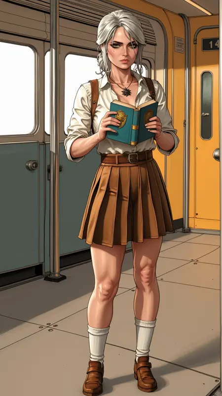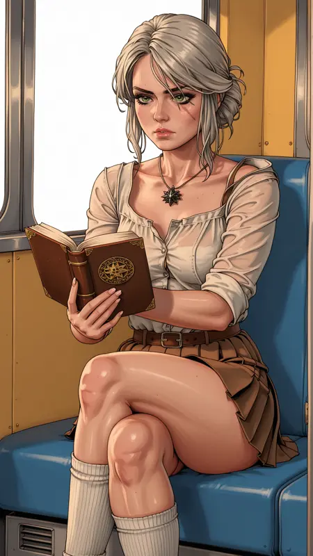 ciri, dark eyeshadow, green eyes, silver hair, hair bun, single scar across cheek,