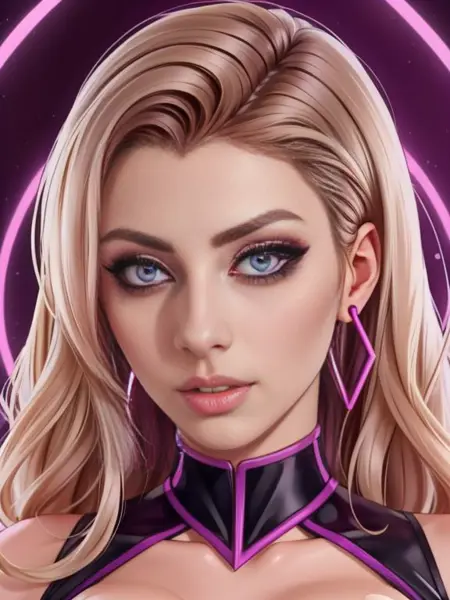 Civitai LoRa 생성자와 다시 함께 놀고 있습니다 - 이번에는 신비롭고 환각적인 윤곽선을 가진 재미있는 스타일로, 배경에 자주 심장 모양이 나타나고 보라색 눈이 특징입니다.