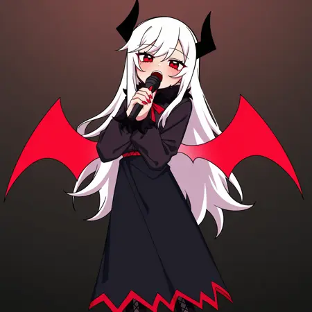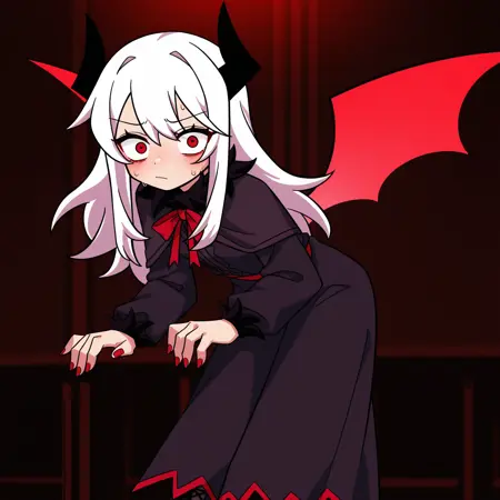VareltFNF, white hair, long hair, red eyes, black horns, neck ribbon, red ribbon, red demon wings, long fingernails, red fingernails, black dress, long dress, black skirt, black boots,