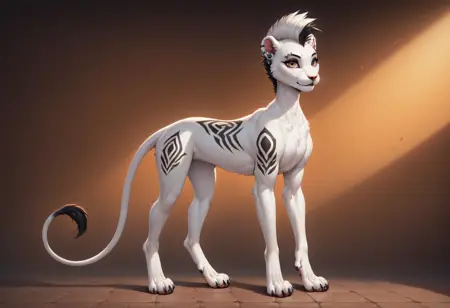 solo , anthro , Zaffa , lioness, Orange gradient eyes, black and white hair , white fur , fluffy fur , detailed fur , black tattoo , eyebrow piercing , ear clip , slim body