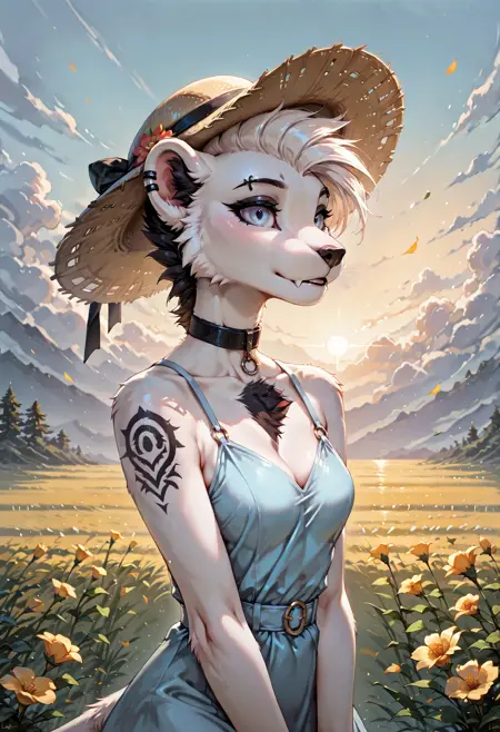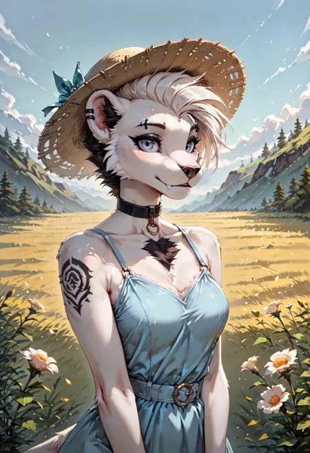 solo , anthro , Zaffa , lioness, オレンジグラデーションの瞳, 黒白の髪, 白い毛並み, ファンシーな毛並み, 詳細な毛並み, 黒いタトゥー, 眉のピアス, 耳のクリップ, スリムな体格