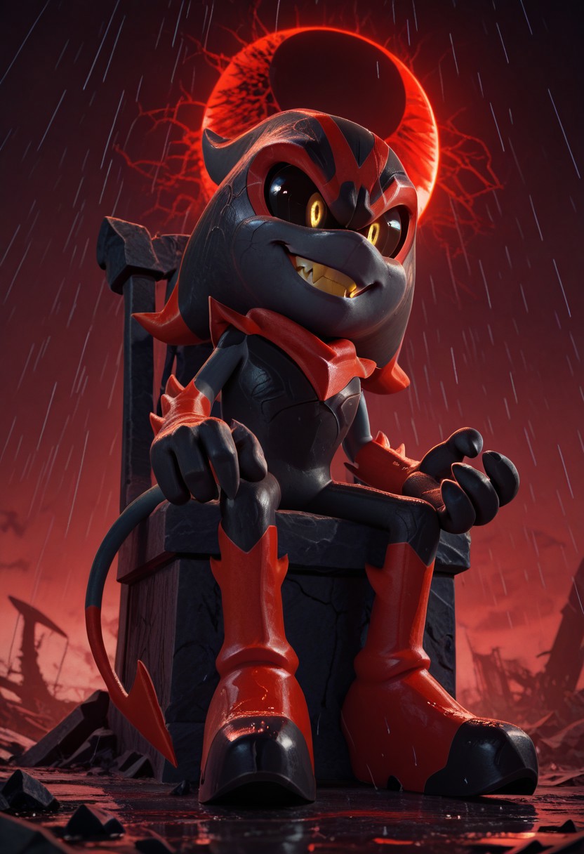 Eclipse The Darkling, dark gray skin, red streaks, black sclera, amber-like gold irises, three fingered hands, two-toed feet, dark gray tail, red tip on tail,yellow teeth