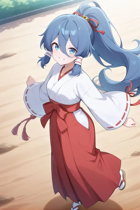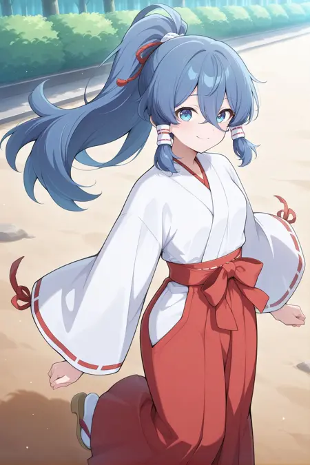 miyadeguchi mizuchi, 1girl, solo, blue eyes, blue hair, very long hair, hair tubes, ponytail, sidelocks,, white kimono, wide sleeves, ribbon-trimmed sleeves, red hakama, miko, tabi, brown sandals,