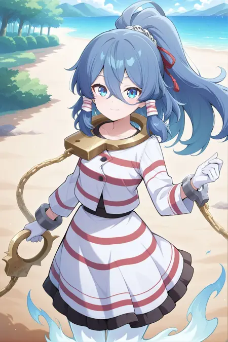 skull hair ornament, white gloves, white shirt, long sleeves, striped shirt, striped skirt, chain, cuffs, shackles, gold handcuffs, sleeve ribbon,