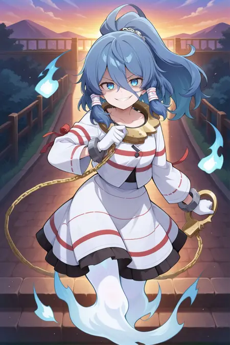 miyadeguchi mizuchi, 1girl, solo, blue eyes, blue hair, long hair, hair tubes, ponytail, ghost tail,