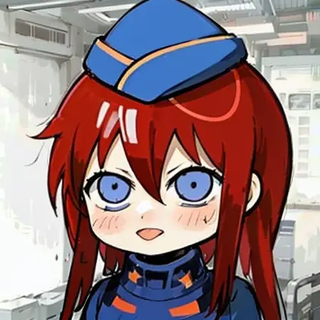 red hair, blue eyes, open mouth, long hair, blue headwear, military hat, military uniform,
