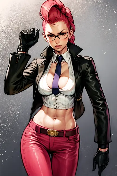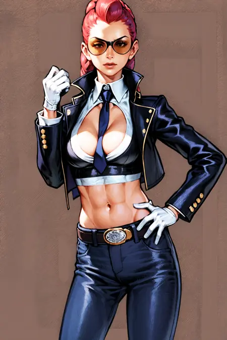 1girl, solo, cviperms, cowboy shot, breasts, sunglasses, necktie, gloves, necktie between breasts, cleavage, crop top, midriff, tinted eyewear, pants,<lora:Kinu Nishimura:0.8>, <lora:Crimson Viper:0.6>