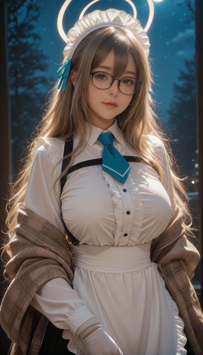 MuroAkane, large breasts, hair between eyes, very long hair, brown eyes, glasses, halo, light brown hair, black-framed eyewear,