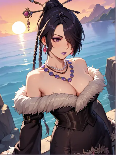 妆容,首饰,红眼,口红,头发遮住一只眼睛,耳环,项链,黑发,发饰,辫子,连衣裙,嘴下痣,露肩,紫色嘴唇,眼影,腰带,长发,毛皮镶边,痣,指甲油,多条腰带,
