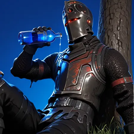 (((male))), knight, black scraf with metal tip trim, short backpack straps with white trim accents, black helmet with red accents, red eyes, black chestplate with red paint, black shirt, black pants, multiple belts, black skirt aventail with metal tip trim, black boots, kneepads, straps, pockets, red arm bandana, oversized black square boots, bigger square hands, fingerless black gloves with red square accent, armor, scratches,