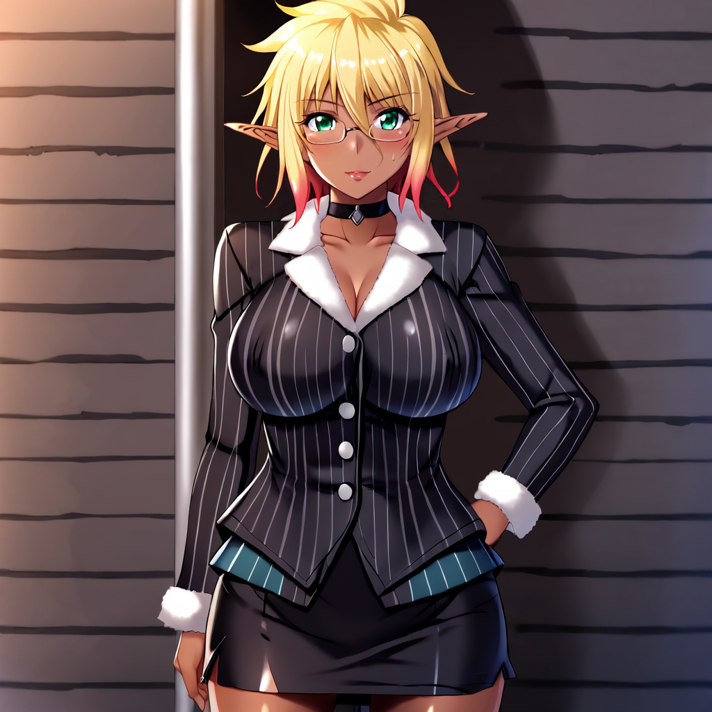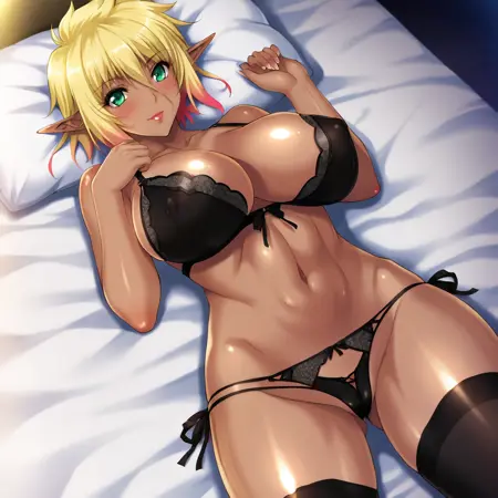 Trigger : Elda, 1girl, large breasts, dark skin, dark-skinned female, blonde hair, pointy ears, elbow gloves, blue thighhighs, navel, green eyes, fur trim, fur collar, black gloves, black panties, elf, multicolored hair, underwear, bikini, hair between eyes, gradient hair, bare shoulders, lowleg, short hair, swimsuit, armor, covered nipples, underboob, gauntlets, side-tie panties