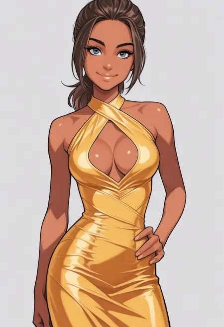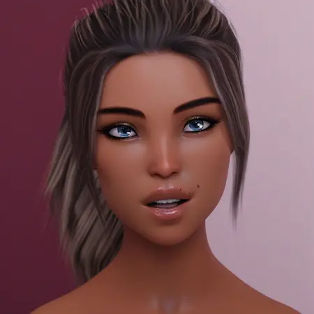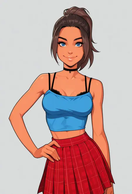 1girl, solo, Josy, dark-skinned male, brown hair, ponytail, highlights, blue eyes, beauty mark,