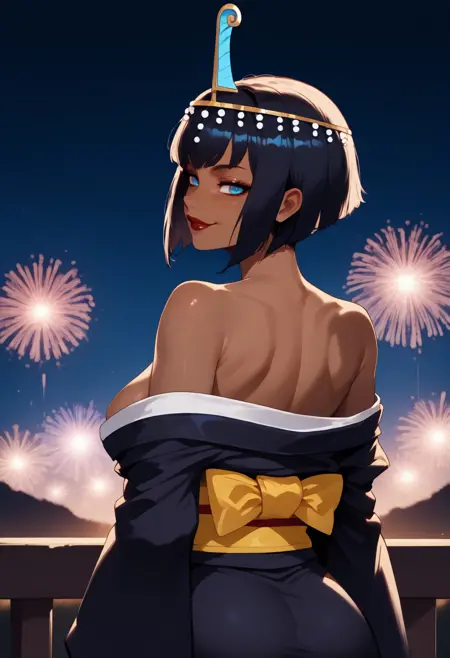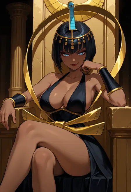 默认服装: tiara, ankh, shawl, hagoromo, black dress, halter dress, showgirl skirt, sideboob, bracer, bare shoulders, cleavage