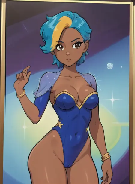 neftis, 1girl, solo, short hair, blonde hair,purple eyes, blue hair, multicolored hair,dark skin, hair over one eye,dark-skinned female, leotard,