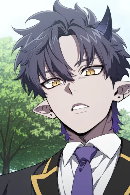 kella_kaldun, kella_kaldun_demon, 单角, 耳洞, 珍珠耳钉, 尖耳, 黄色眼睛, 黑发, 彩色发梢, 紫色头发, 中分刘海