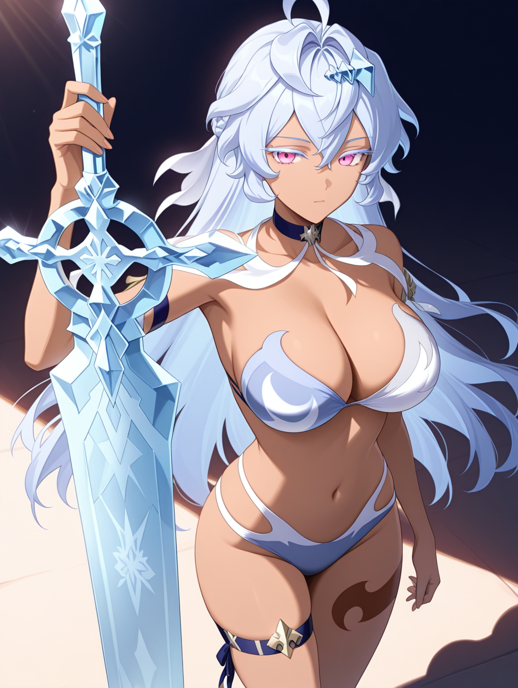 服装:蓝色冰晶发饰,深靛蓝色项圈,带宝石项圈,奇幻比基尼,石板蓝-银色比基尼,无肩带比基尼,不对称比基尼,装饰性漩涡图案,金色髋部装饰,右大腿环,深靛蓝色环,(左腿奇幻纹样),白色纹样,棕色纹样,蓝色露趾高跟凉鞋,金色绑带凉鞋,