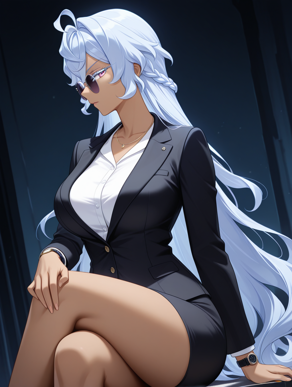 角色:LetheE7, Lethe_Def, 棕色皮肤女性,成熟女性,长发,银蓝色头发,波浪发,层叠发,半扎编发,天线发,粉红色眼睛,锐利眼神,银蓝色睫毛,