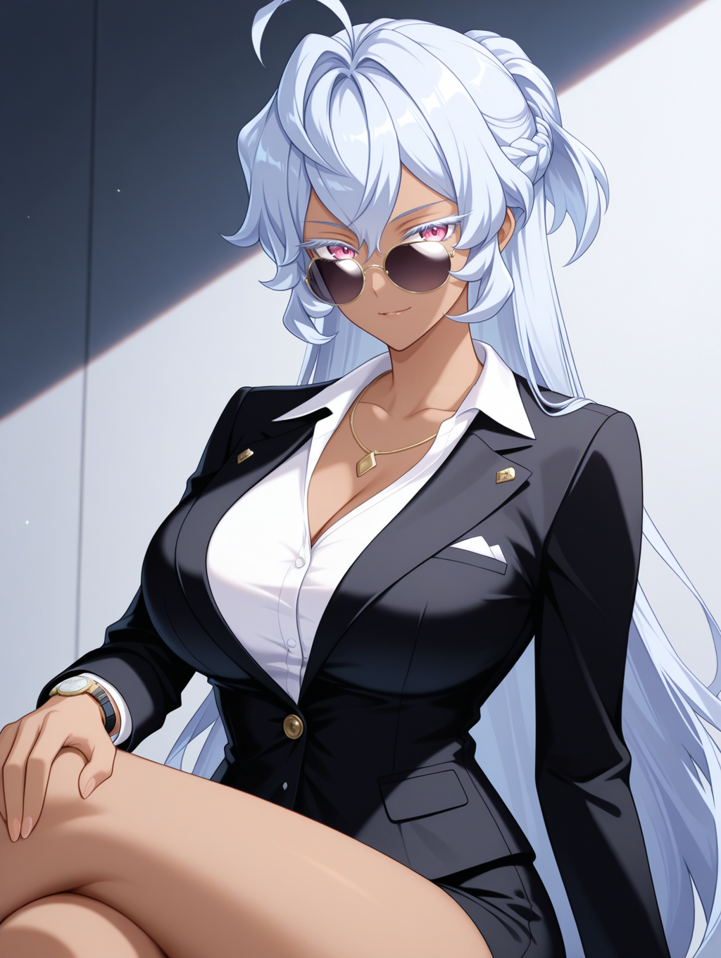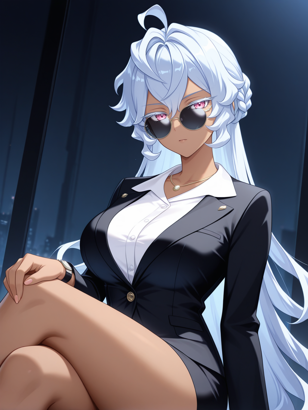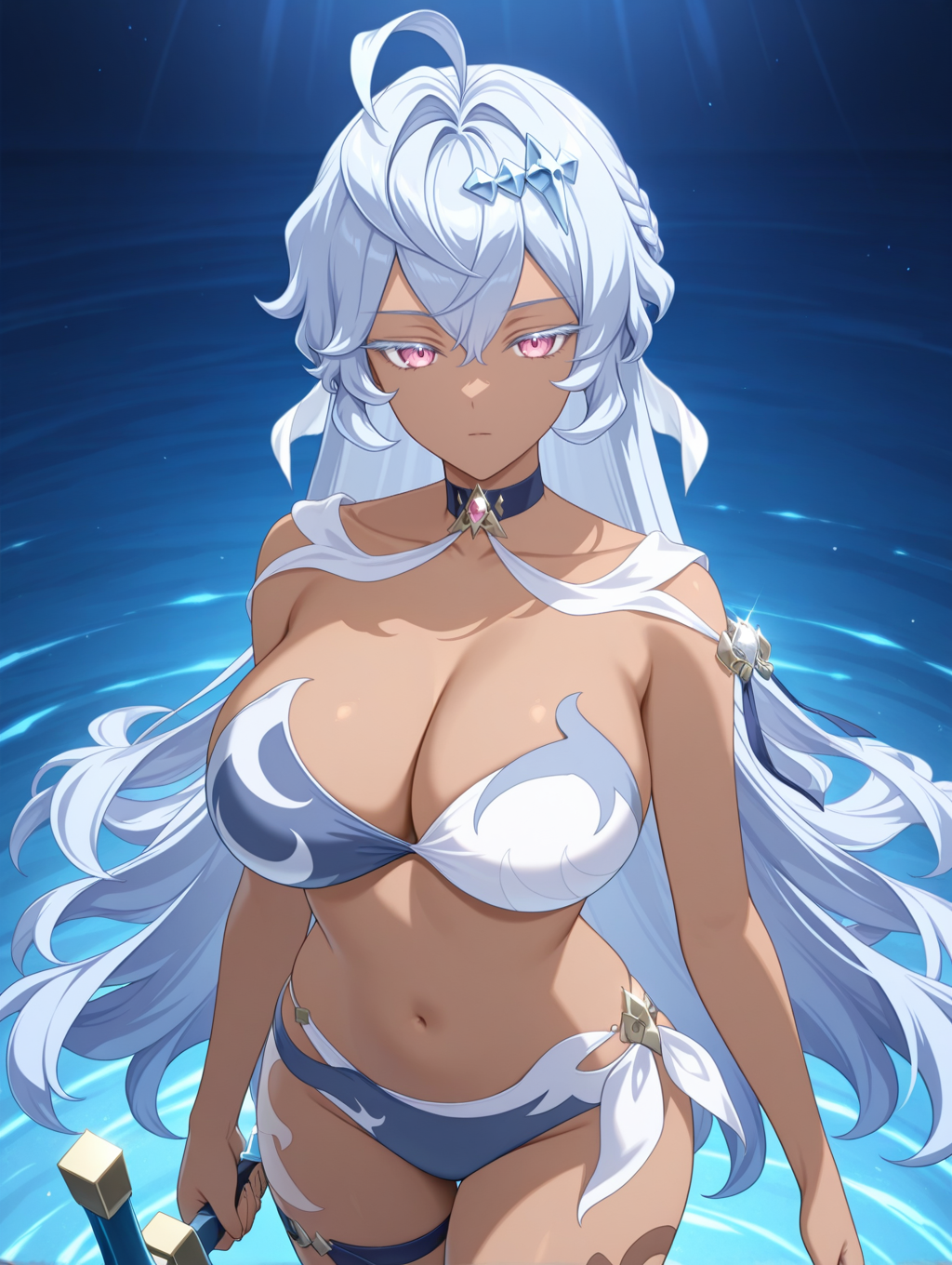 캐릭터: LetheE7, Lethe_Def, 갈색 피부 여성, 성숙한 여성, 매우 긴 머리, 은-파랑색 머리, 물결 모양 머리, 층층이 된 머리, 반올림 땋은 헤어스타일, 아호게, 분홍색 눈, 날카로운 눈, 은-파랑색 속눈썹,