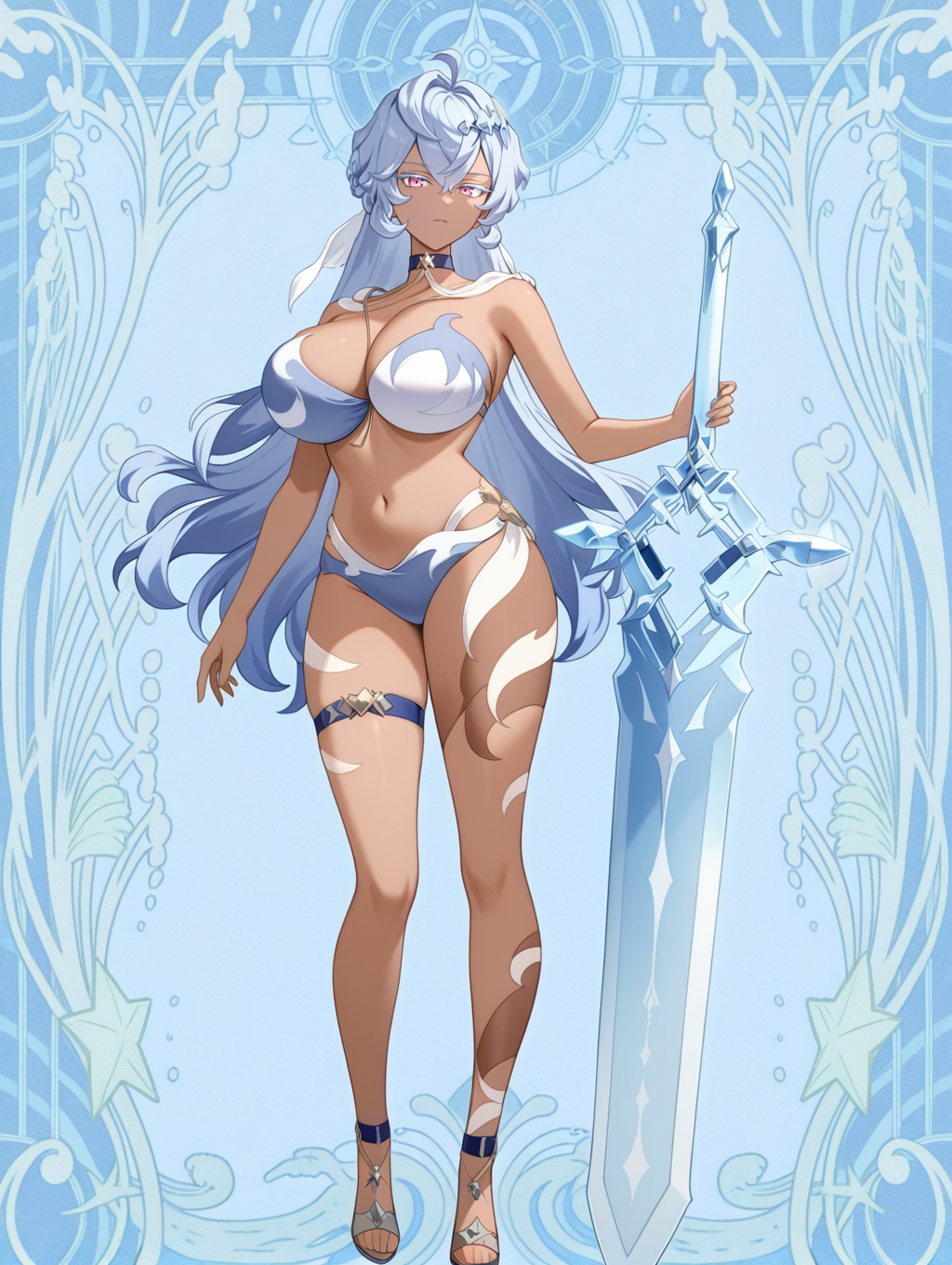 옷: 파란 얼음 머리 장식, 어두운 인디고 초커, 보석이 달린 초커, 판타지 비키니, 회색-은색 비키니, 스트랩 없는 비키니, 비대칭 비키니, 장식용 나선 무늬, 금색 엉덩이 장식, 오른쪽 허벅지 밴드, 어두운 인디고 밴드, (왼쪽 다리 판타지 문양), 흰색 문양, 갈색 문양, 파란색 오픈 토 하이힐 샌들, 금색 스트랩 샌들,