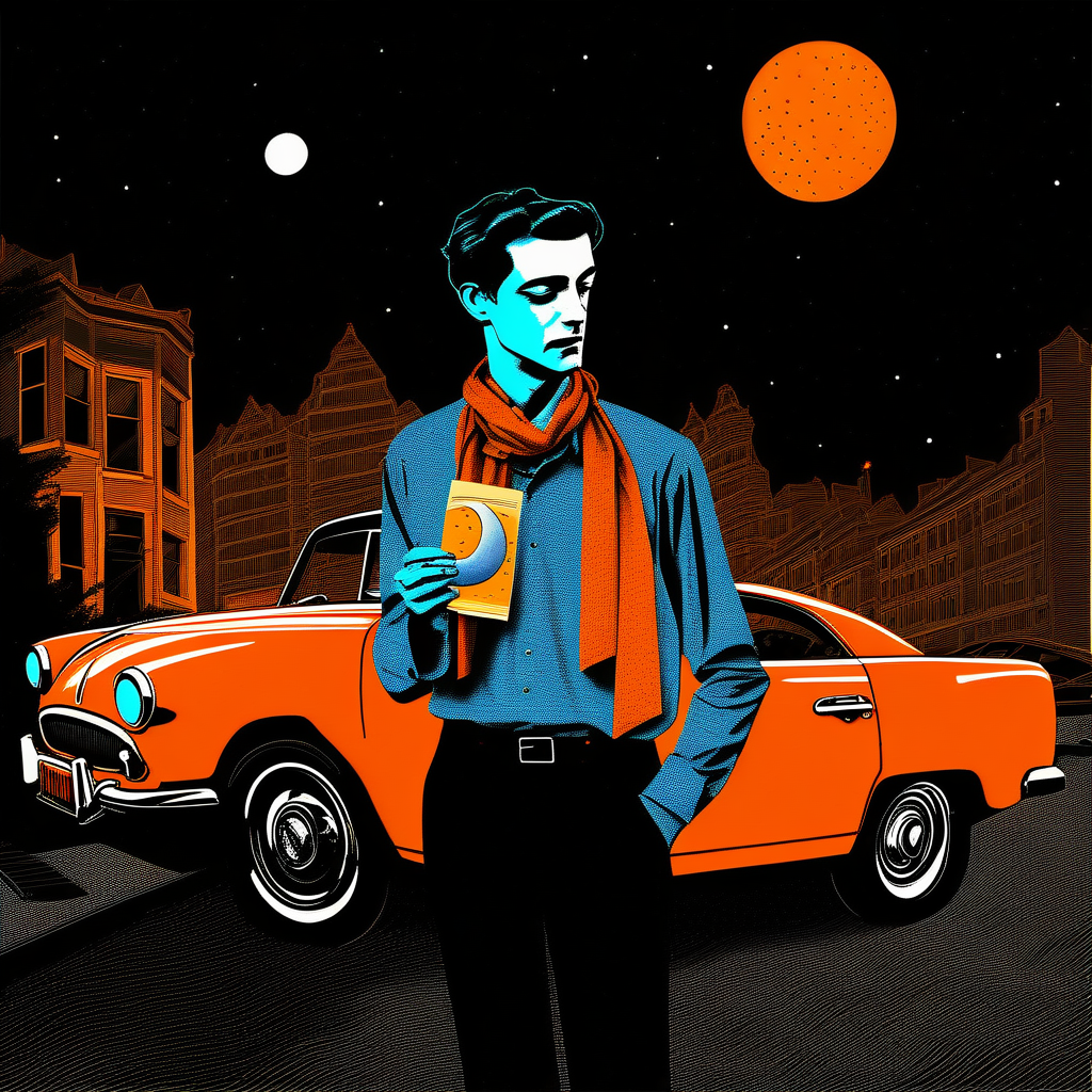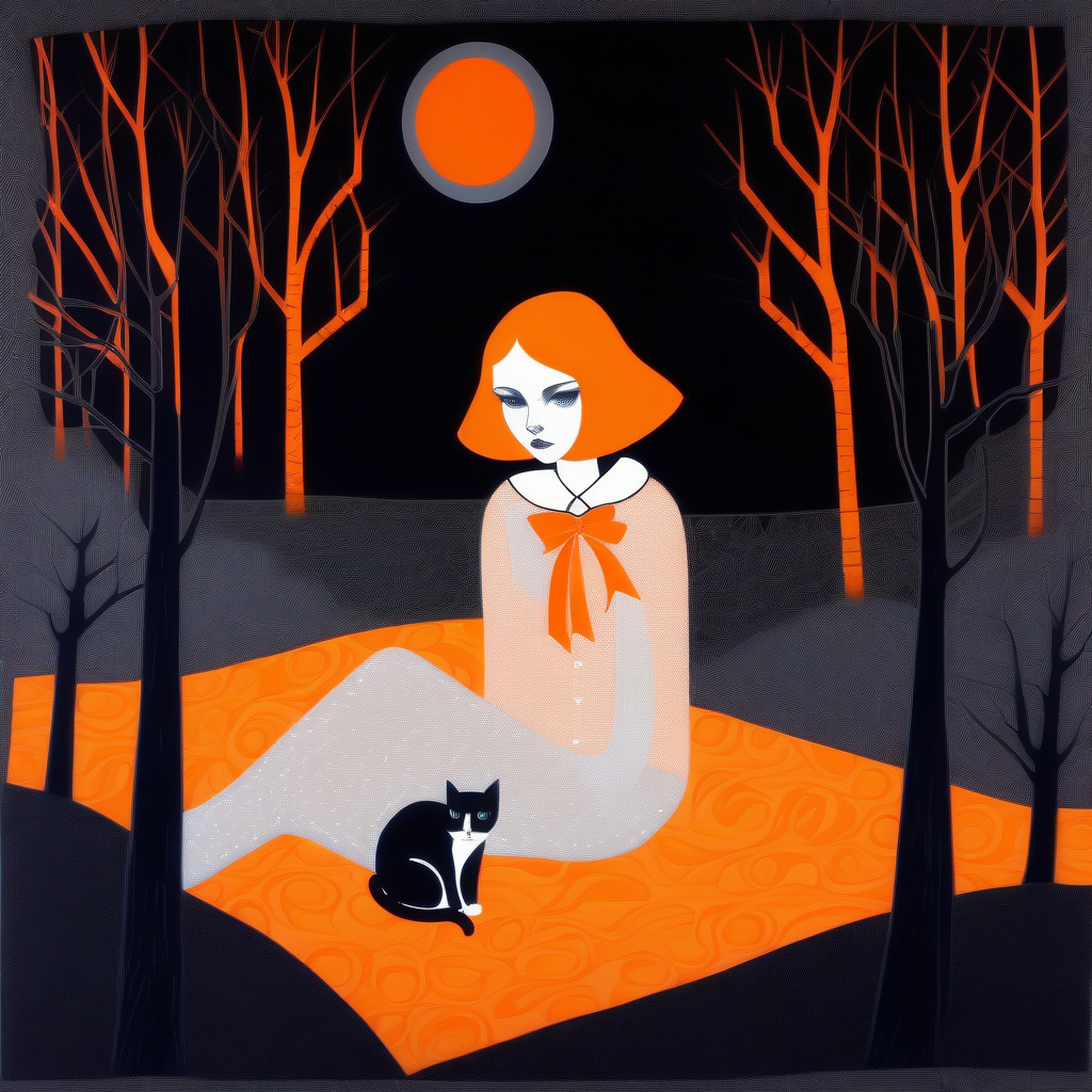 使用以皇家蓝、紫色、黄色和黑色为主的有限色彩调色板的风格化卡通插图;略带棱角、近乎立体主义的特征。图案与纹样。手绘质感。城市与森林。
