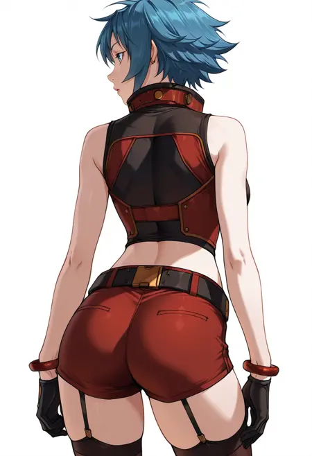 sonia_cnr_s2, red shorts, sleeveless, belt, black gloves, thighhighs, garter straps,bracelet, midriff,