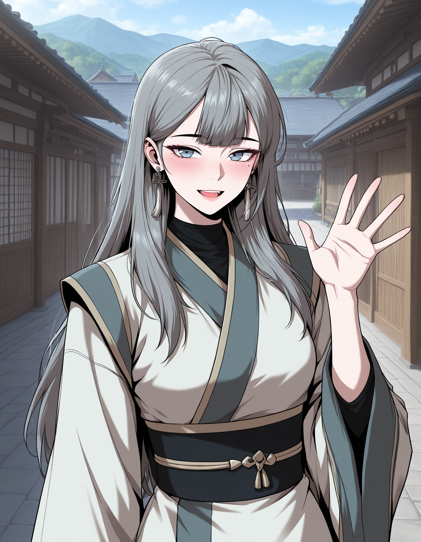 jegal sohee, 1girl, solo, long hair, long sleeves, wide sleeves, undershirt, kimono, grey hair, bangs, mole under eye, jewelry, earrings,
