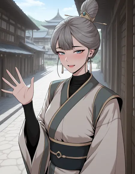 jegal sohee, 1girl, solo, long sleeves, wide sleeves, undershirt, kimono, grey hair, single hair bun, bangs, mole under eye, jewelry, earrings, hair ornament,和服 + 长发