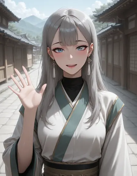 jegal sohee, 1girl, solo, long hair, long sleeves, wide sleeves, undershirt, kimono, grey hair, bangs, mole under eye, jewelry, earrings,