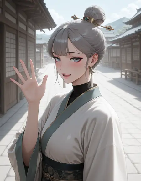 jegal sohee, 1girl, solo, long sleeves, wide sleeves, undershirt, kimono, grey hair, single hair bun, bangs, mole under eye, jewelry, earrings, hair ornament,着物 + 長髪
