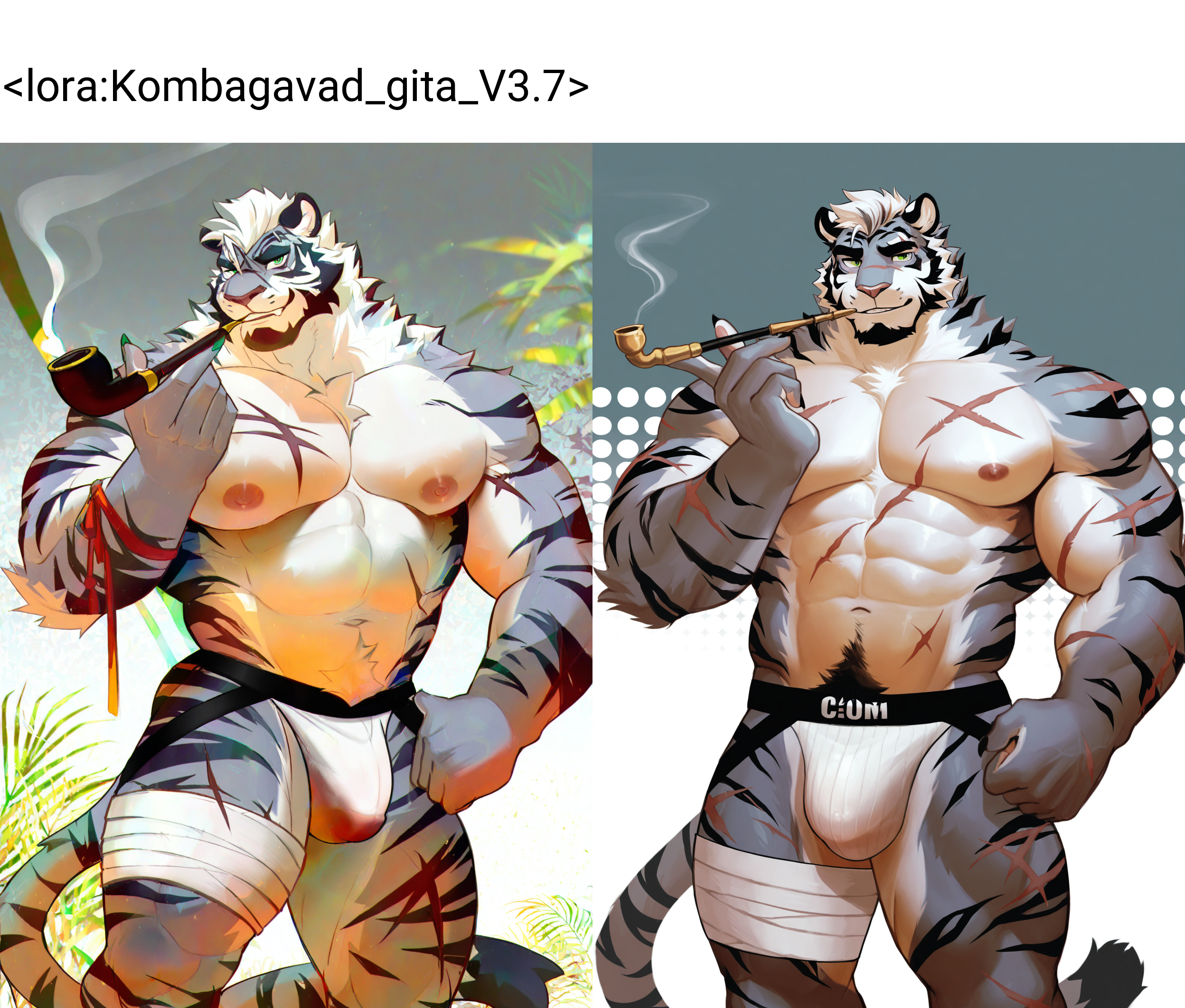 주의: 캐릭터에 프롬프트에 없는 특징(예: 보라색 피부, 별 모양 호랑이 무늬)이 나타난다면, LoRA 조합이 과적합되었음을 의미합니다.