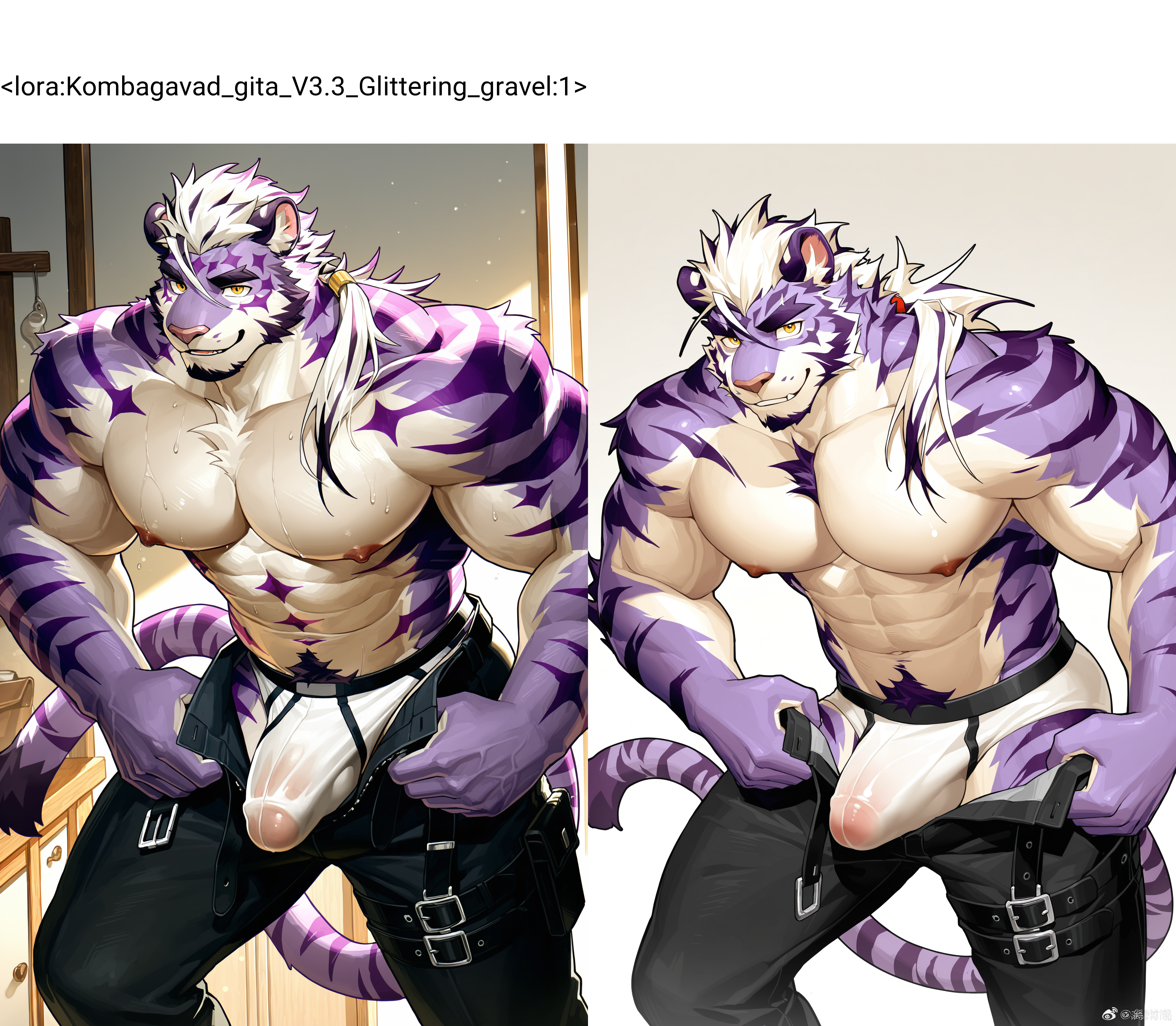 注意:若您角色突然出现未提示的特征,如紫色皮肤或星形虎纹,说明LoRA组合已过拟合。
