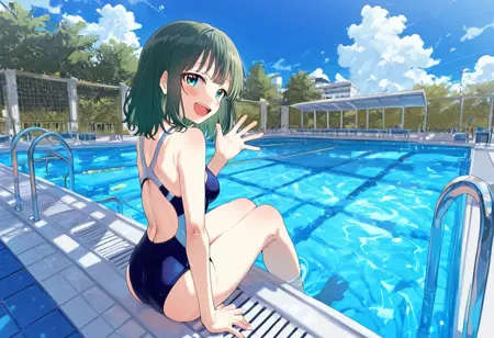 outdoors,pool ladder, poolside, white pool ladder,reflected water,blue sky,white roof,tree