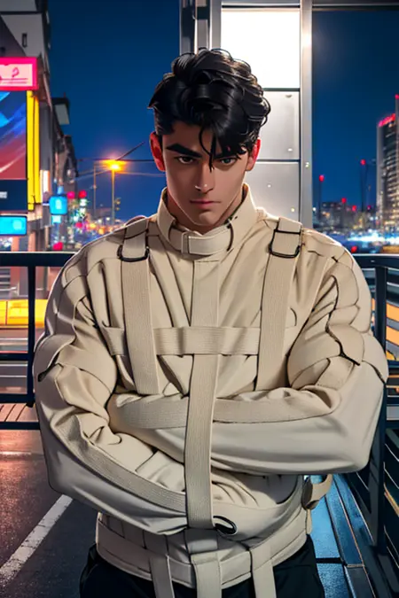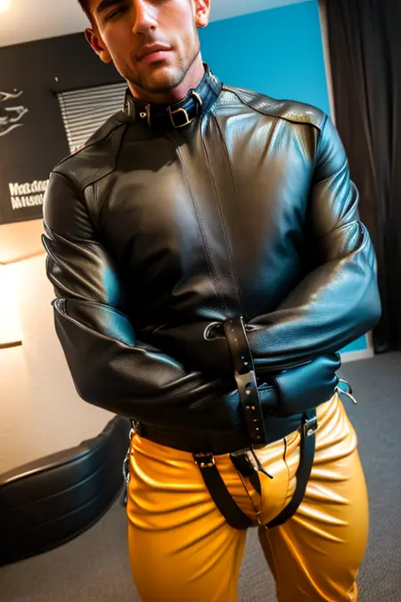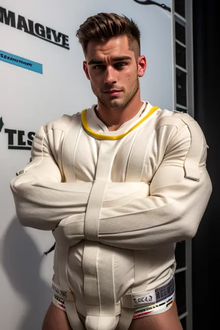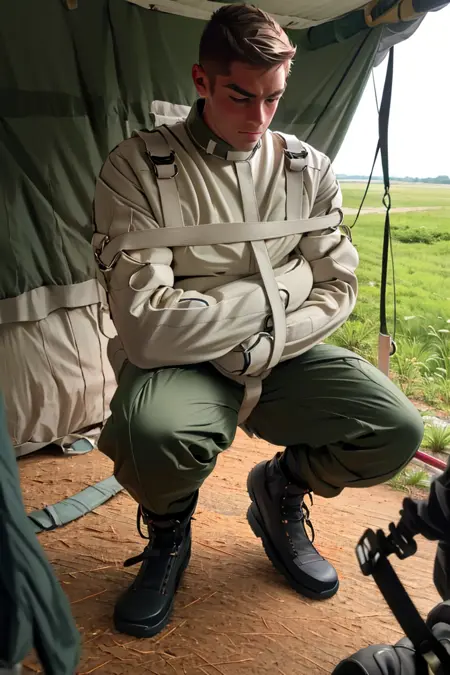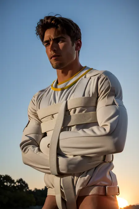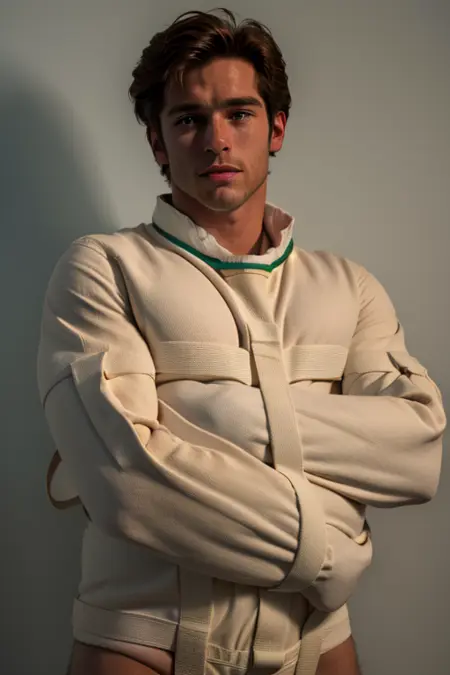 Male focused straitjacket LoRA, based on Psycho-II, 8118 and Classic Asylum brand straitjackets. All example images are generated in txt2img, without img2img, inpainting, and post editing.
