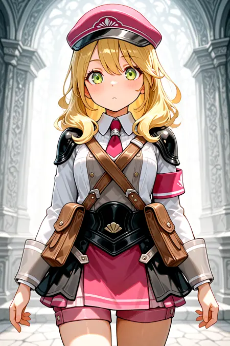 ユニフォーム, シャツ, ポロシャツ, ジャケット, スカートの下のピンクのショーツ, スカート, ピンクの頭飾り, ピークキャップ, 長袖, アームバンド, 赤いネクタイ, 肩甲板, ベルト, ベルトポーチ, バッグ, ソックス, ニーハイ, ブーツ
