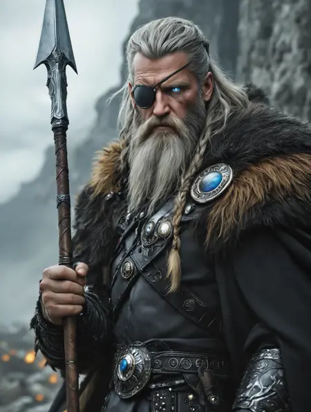 🧩 추천 태그:odin, one-eyed man, eye patch, grey hair, white hair, grey beard,braided hair,rune armor, runic robe, fur armor,gungnir / spear,mythic god, viking fantasy, norse cloak, spear, allfather, wolf / wolves, raven,nordic mythology