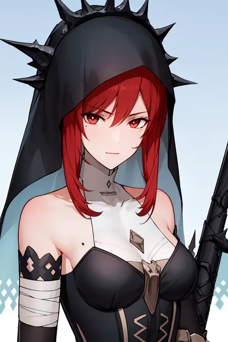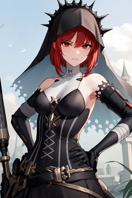 她的悲伤玫瑰涂层外观可通过以下提示调用:“lora:VeraPGRgarnetv1:strengthVerapgr_srfo, 黑白夹克, 防护手套, 连裤袜, 带刺刀鞘, 高跟靴,”。