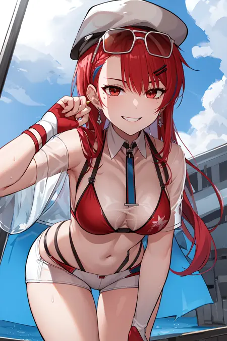 她的波浪弯曲涂层外观可通过以下提示调用:“lora:VeraPGRgarnetv1:strengthVerapgr_wabe, 双色编发, 太阳镜戴在头上, 鱼形耳环, 发夹, 尖顶帽, 透明领露脐上衣, 白色刀鞘, 红色比基尼, 无指手套, 蓝色指甲, 白色超短裤, 大腿绑带, 项圈,”。