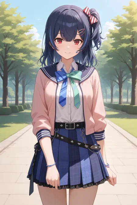 eerinze, red eyes, blue hair, streaked hair, side ponytail, rinzegyaru, striped hair bow, hairclip, star facial mark, multicolored bowtie, green bowtie, blue bowtie, white dress shirt, blue sailor collar, pink jacket, open jacket, bracelet, multicolored skirt, blue skirt, plaid skirt, pleated skirt, frilled skirt, black belt, multiple belts,