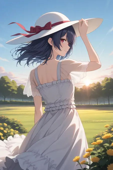 ffrinze, red eyes, blue hair, medium hair, rinzesundress, sun hat, white hat, hat bow, hat ribbon, white dress, sundress, frilled dress, short sleeves, see-through sleeves,