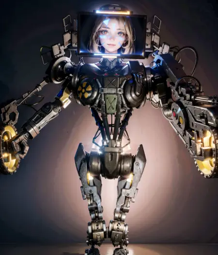 아마 robocain, robocop 2, weapon, robot joints, mecha, robot 등의 프롬프트로(Trigger Word) 이 소름끼치는 괴물 로봇의 그림을 생성하실 수 있겠습니다. 또한, monitor head 프롬프트를 추가하면 특유의 화면 얼굴이 펼쳐진 robocain의 그림을 뽑을 수 있을 겁니다.