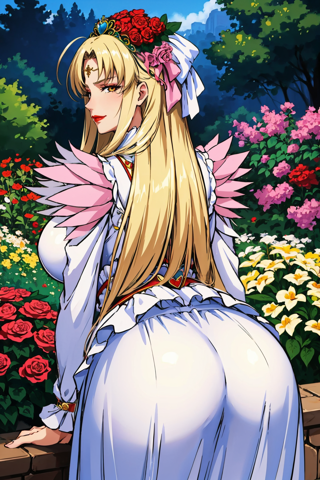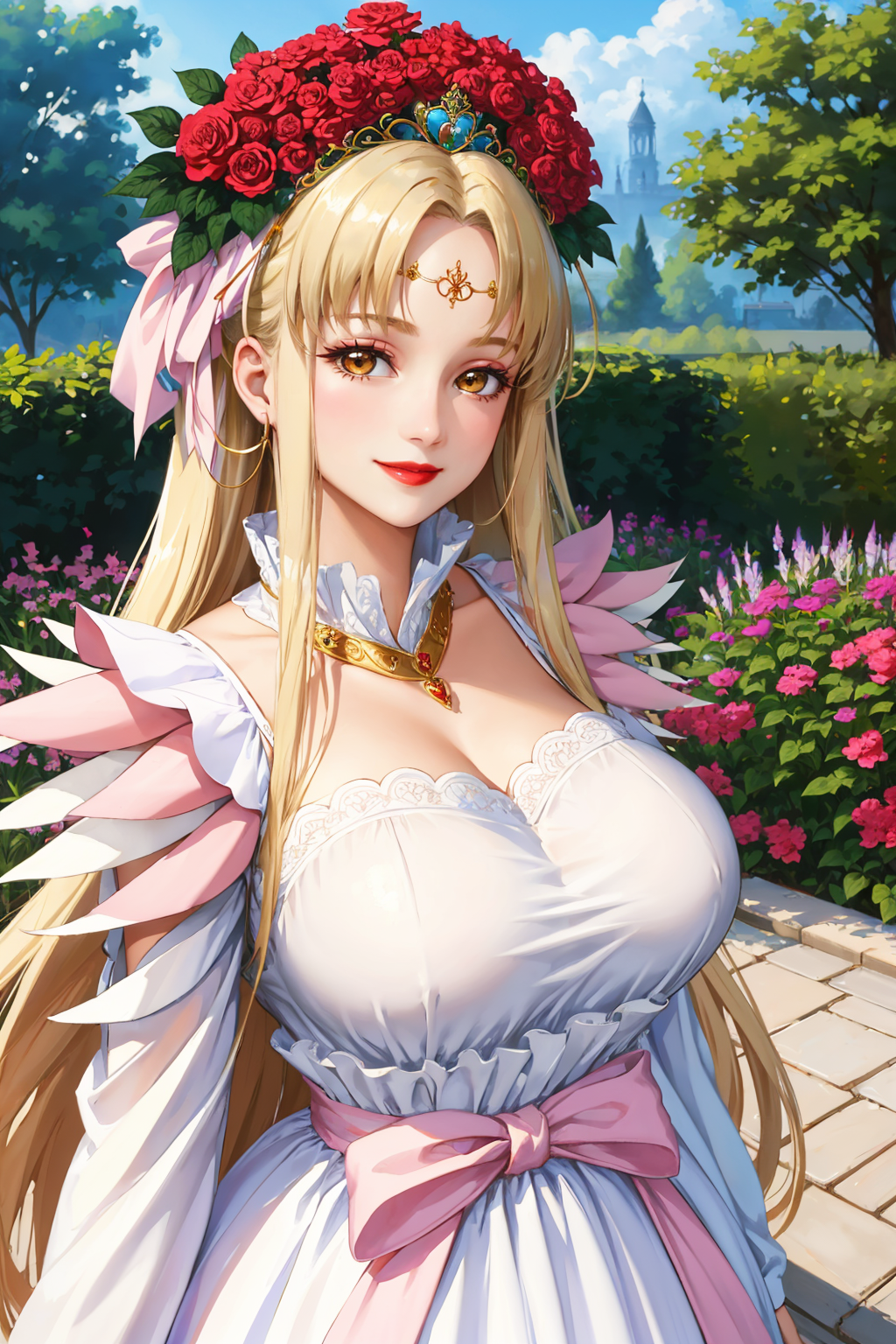 为体现她的典型造型,可添加 "王冠、发带、发饰花、连衣裙、口红"。