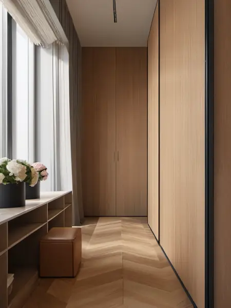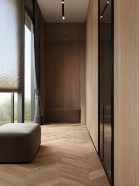标签和关键词包括:cloakroom、衣橱、木地板、衣物、磁轨灯(磁性轨道灯)等。提示未指定特定颜色或材质。