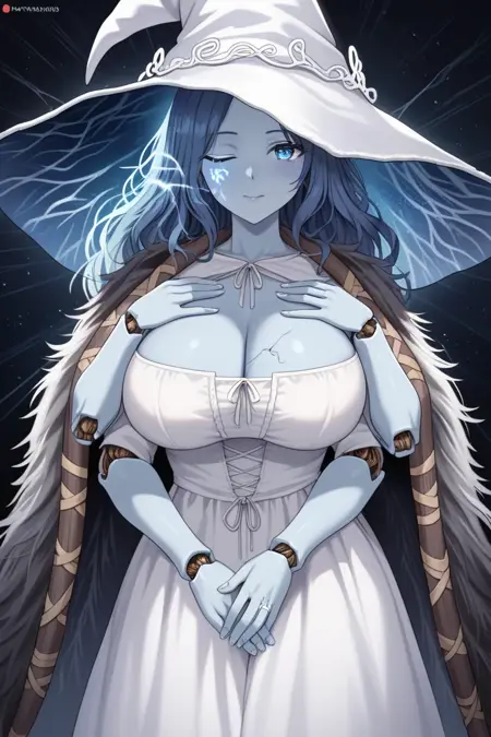 1girl, Ranni, cracked skin, doll joints, blue eyes, one eye closed, blue hair, blue skin, colored skin, extra faces, 4 arms:1.3, white dress, long sleeves, light fur cloak, witch hat, white headwear