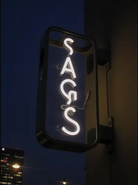 キュー語:ネオンサイン。画像には、ダイナミックなポーズで踊っているかアクロバット的な動作をしている人間のスタイリッシュな描画が施されたネオンサインが表示されています。ネオンサインは暗い煉瓦の壁に設置されており、明るいピンクのネオンカラーを強調するコントラスト背景となっています。サインは白い表面(テーブルや棚など)に取り付けられており、全体的なシーンは現代的で芸術的な雰囲気を持ち、ネオンサインが画像の焦点となっています。
