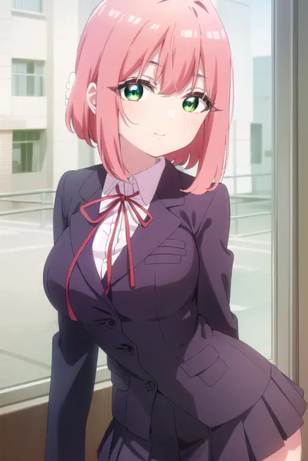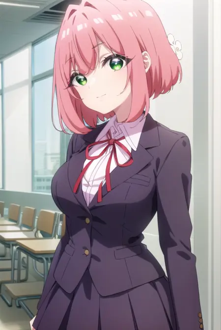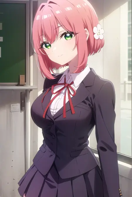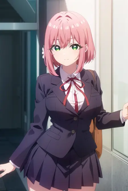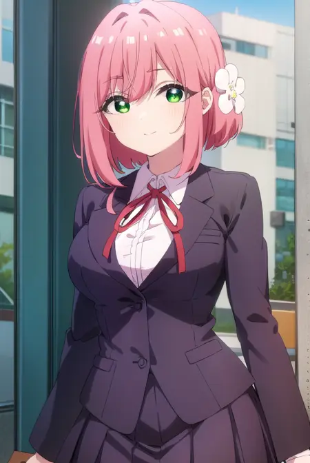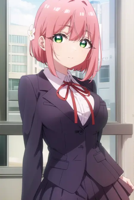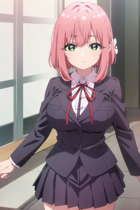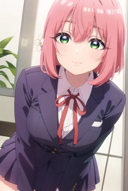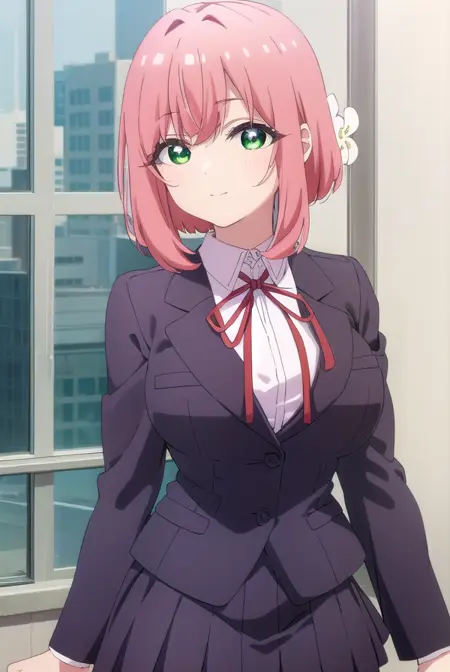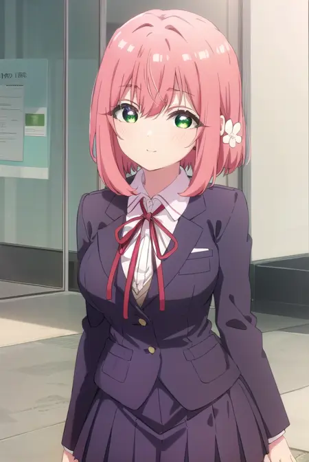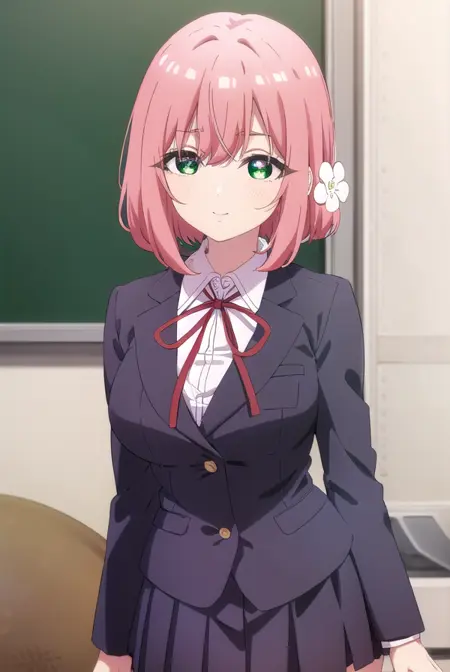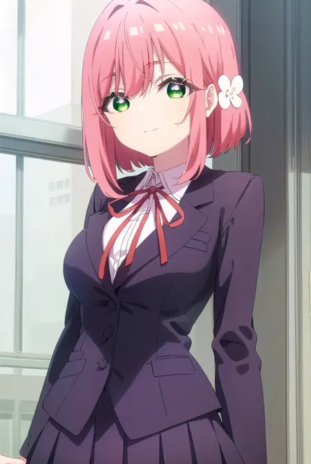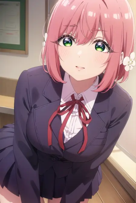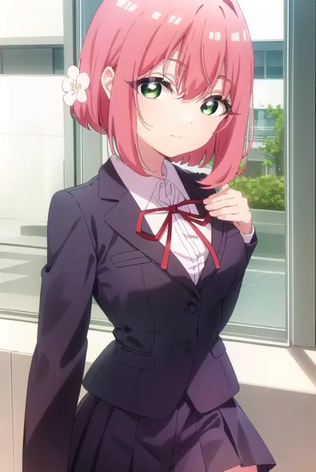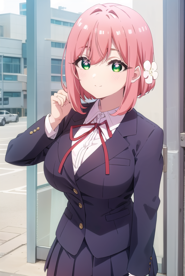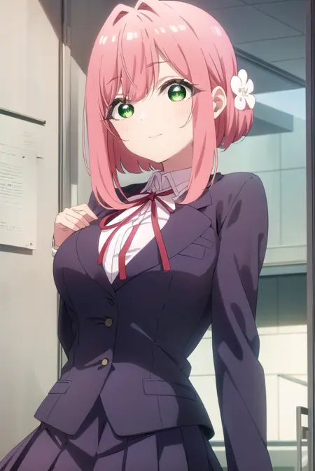 hakari hanazono,短发,发饰,(绿色眼睛:1.5),粉发,花朵,发花,发丝垂于眉间,鬓发,